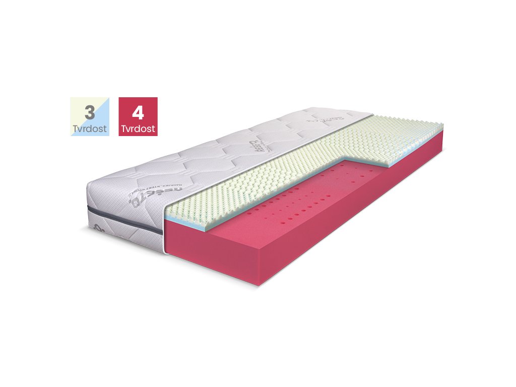 Jádro dvoutuhostní matrace z antibakteriální pěny je upraveno moderní technologií ŘEŠETO. Roznášecí deska VISCO/Hypersoft studené pěny a otevřenou strukturou a jedinečnou měkkostí, zajišťuje relaxaci pro Vaše tělo. Tyto úpravy zaručují vynikající odvětrání jádra. Nopová profilace povrchu zajišťuje odlehčení exponovaných míst na těle, zlepšuje prokrvení pokožky a zvyšuje prodyšnost. Antibakteriální pěny nejen eliminují výskyt roztočů, ale také zabraňují vzniku hub a plísní. Použité materiály mají vynikající odolnost proti proležení a zaručují vysokou životnost.